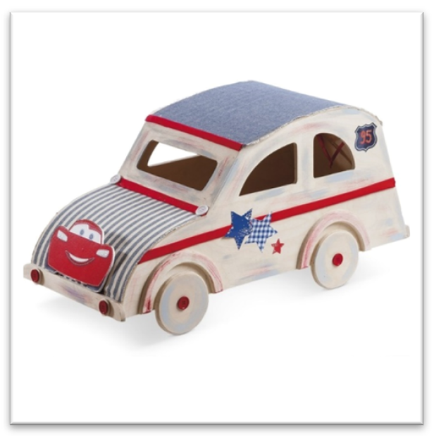 Το μπροστινό μέρος του κουτιού είναι διακοσμημένο με την ξύλινη φιγούρα του McQueen, ενώ το πλαϊνό μέρος του κουτιού διακοσμούν ξύλινο σηματάκι και αστεράκια σε αποχρώσεις μπλε-κόκκινες
