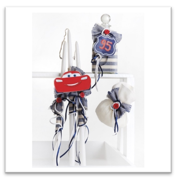 Disney σετ λαδιού σε μπλε-κόκκινες αποχρώσεις στολισμένα με φιγούρα ξύλινη μικρή του McQueen και ξύλινο σηματάκι,με κορδέλες σατέν και κορδόνια